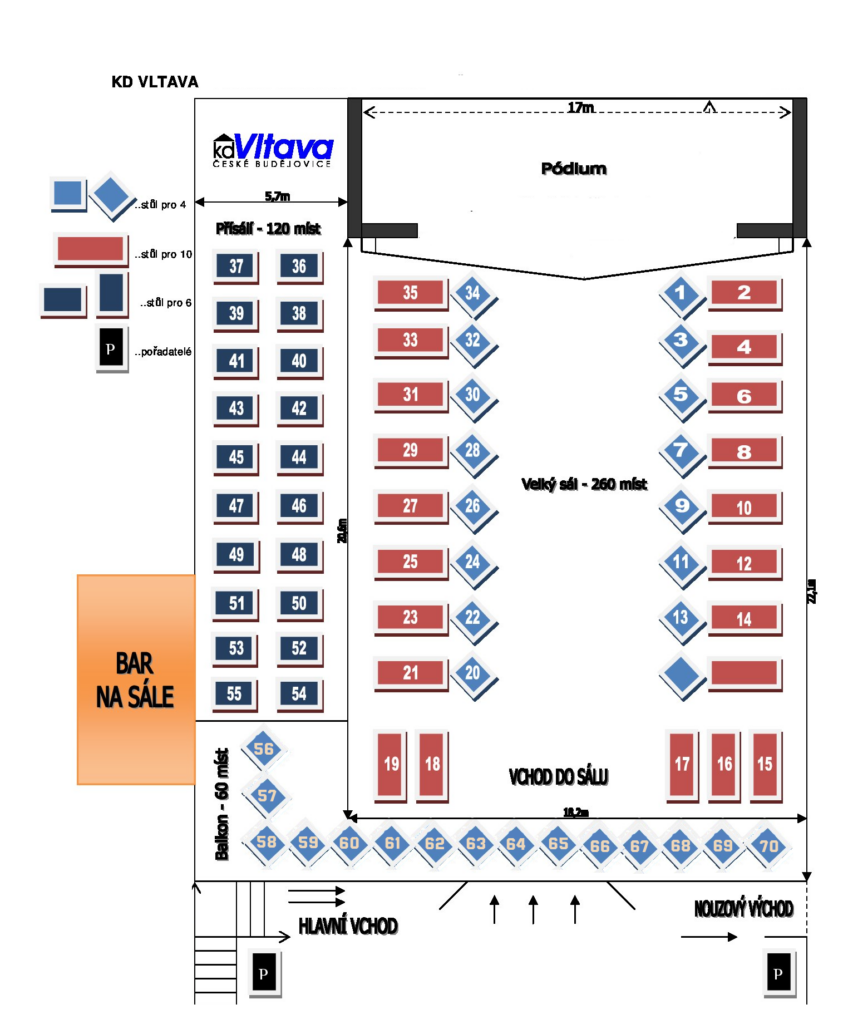 Připojený obrázek sálu vás jistě zorientuje v prostoru KD Vltava.